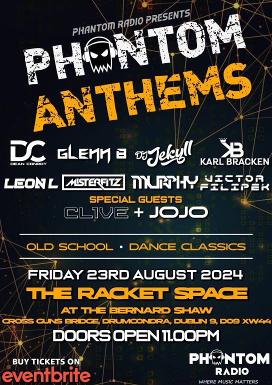 The Phantom Radio crew will take over The Racket Space at The Bernard Shaw for Phantom Anthems on Friday 23rd August 2024. The event will feature a stacked lineup of Phantom regulars including Dean Conroy, Glenn B, DJ Jekyll, Karl Bracken, Leon L, MisterFitz, Murphy and Victor Filipek, along with special guest Clive and JoJo on MC duties.